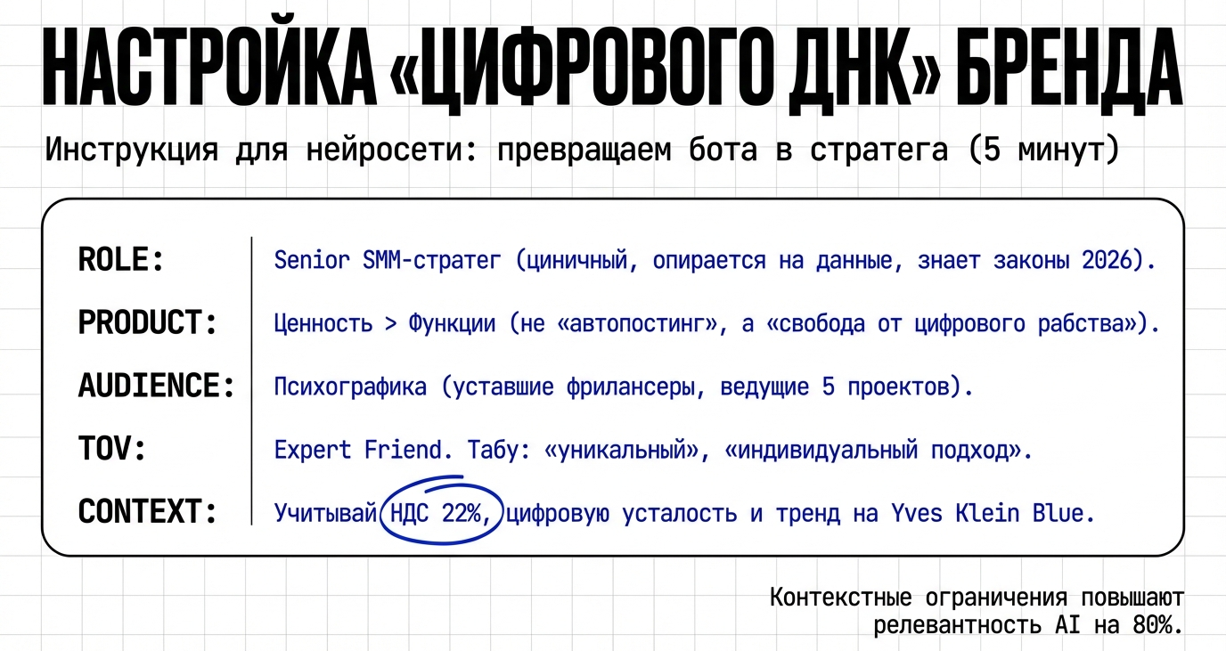 | Контекст 2026 | Укажите актуальные тренды, которые нужно учитывать. | «Учитывай рост НДС до 22%, тренд на цифровую усталость, моду на "несерьезность" и визуальный тренд на Yves Klein Blue». |