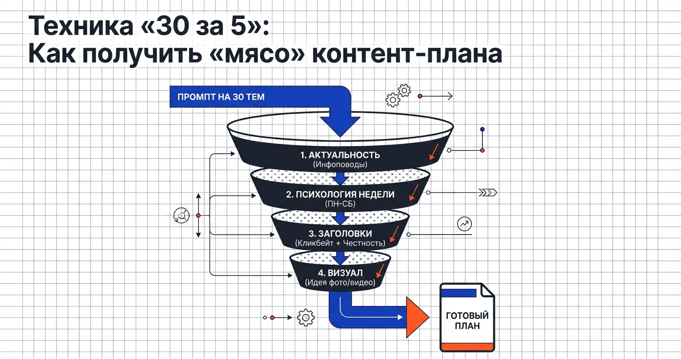 Используем технику «30 за 5». Мы просим сгенерировать 30 тем, но прогоняем их через фильтры актуальности.
