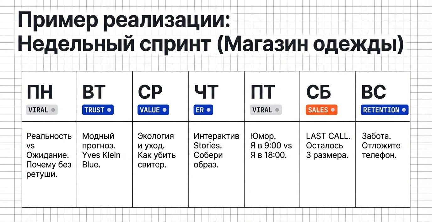 Чтобы закрыть ваш запрос на контент-план пример, ниже представлена детальная матрица на одну неделю, разработанная с учетом всех реалий 2026 года. Мы возьмем нишу Магазина женской одежды, так как она наглядно демонстрирует работу с визуалом и продажами, но логика применима к любому бизнесу.
