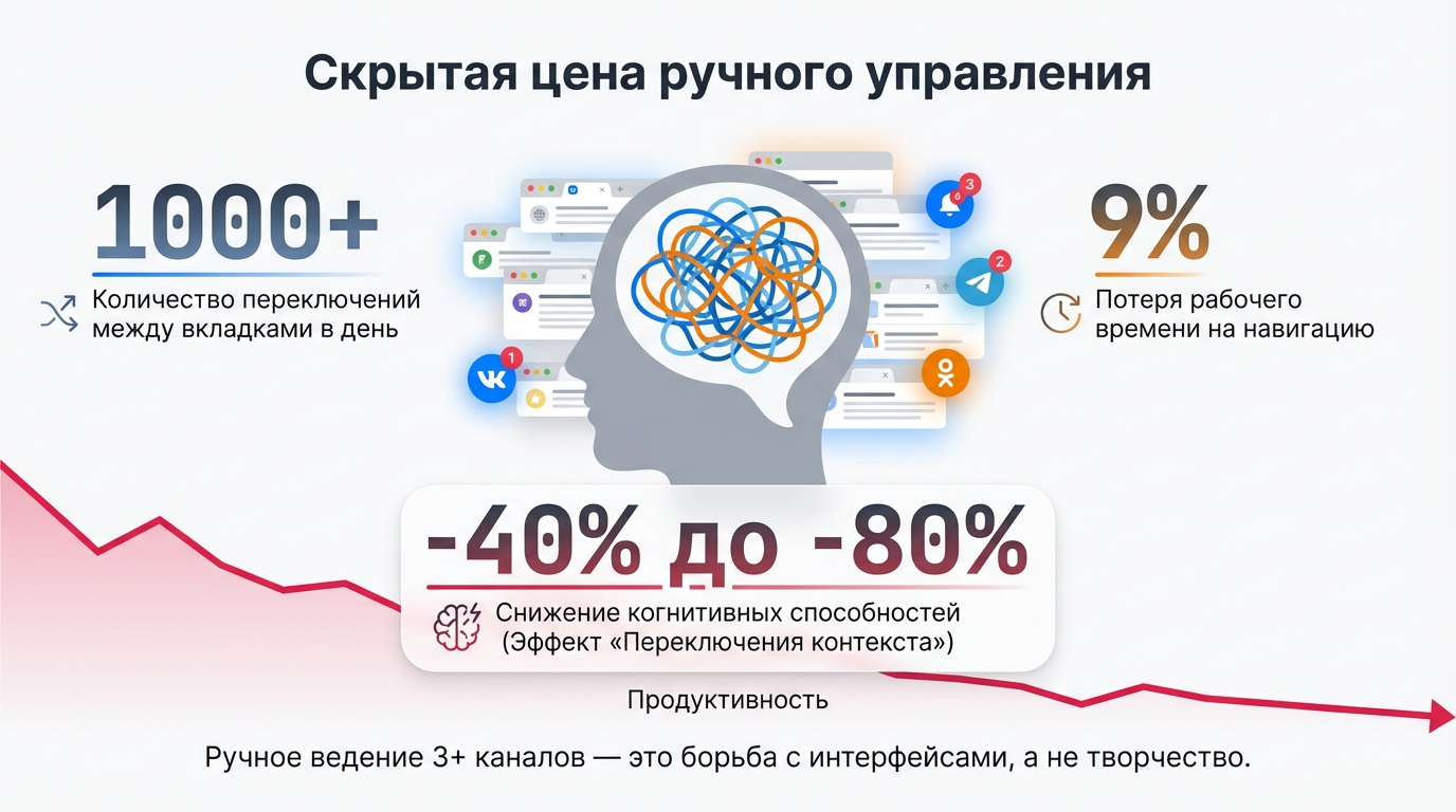 Одной из главных скрытых издержек SMM является «переключение контекста» (context switching). Согласно исследованиям Harvard Business Review и других аналитических центров, сотрудники переключаются между приложениями и вкладками более 1000 раз в день, что съедает до 9% рабочего времени и снижает когнитивные способности на 40%.