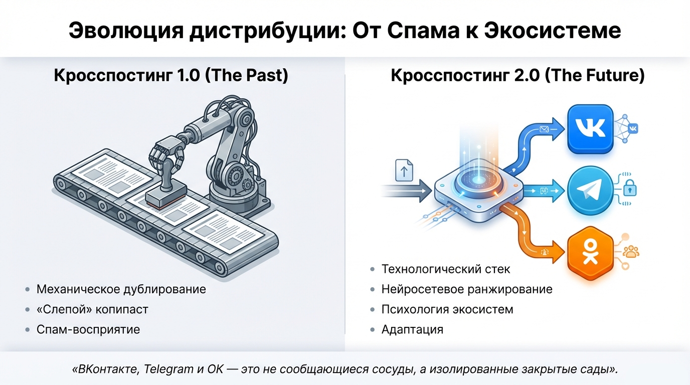 На смену ей пришла концепция «Кросспостинга 2.0» - сложной, технологически насыщенной дисциплины, требующей глубокого понимания технического стека платформ, нюансов нейросетевого ранжирования и психологии потребления контента в изолированных цифровых экосистемах.