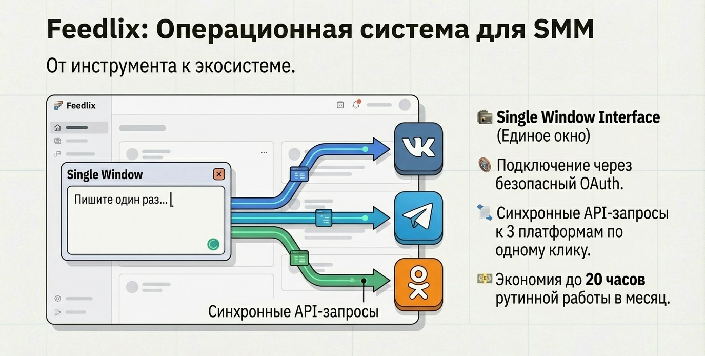 Платформа Feedlix представляет собой решение класса «All-in-One» (все в одном окне). Это не просто планировщик, а операционная система для управления контентом, которая закрывает пробел между необходимостью присутствия на всех площадках и ограниченностью человеческих ресурсов.